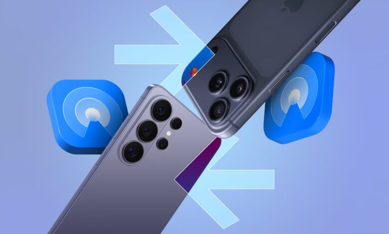 رسم توضيحي لأيقونات Apple وAndroid المتصلة في مسار منقط يحيط بشعارات AirDrop وQuick Share
