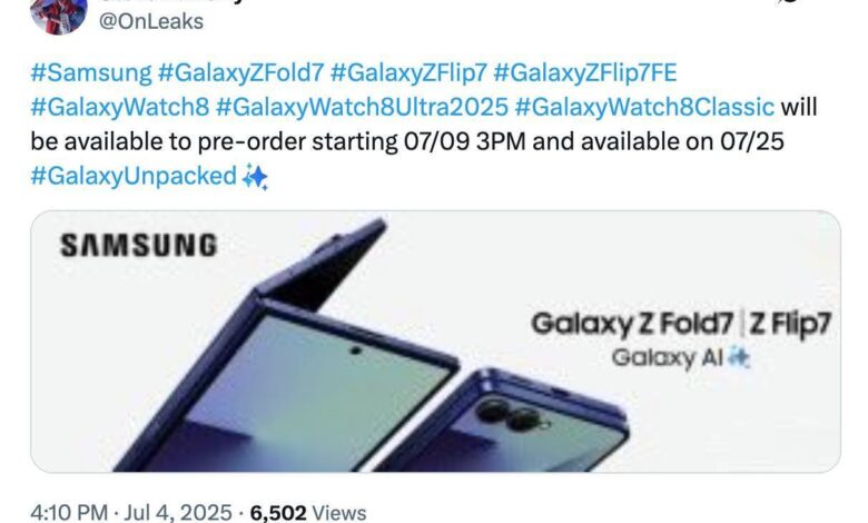 تم تعيين Samsung جميعها لاستضافة الحدث الذي تم تفريغه التالي في 9 يوليو للكشف عن Galaxy Z Fold 7و ض الوجه 7و ض الوجه 7 Fe ، و Galaxy Watch 8 مسلسل. نعلم الآن متى سيتم عرض هذه المنتجات للبيع ، وذلك بفضل التسرب الموثوق Steve H.Mcfly.ال Tipster تدعي أن الطلبات المسبقة ستفتح في نفس اليوم في الساعة 3 مساءً ، في حين ستبدأ الأجهزة في الجيل التالي في الشحن في 25 يوليو. تسرب سابق قال إن الهواتف ستذهب للبيع في أغسطس.