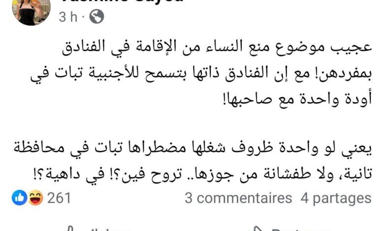 وكتبت ياسمين الخطيب: “عجيب موضوع منع النساء من الإقامة في الفنادق بمفردهن! مع إن الفنادق ذاتها بتسمح للأجنبية تبات في أودة واحدة مع صاحبها!”.