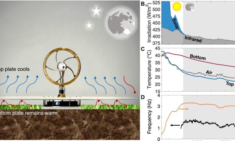 عادةً، لتشغيل المحرك، يتم تسخين جانب واحد ويتم الاحتفاظ بالجانب البارد بالقرب من درجة الحرارة المحيطة. اتخذ مونداي وطالب الدراسات العليا تريستان ديبي نهجًا مختلفًا: فقد استخدموا برودة السماء ليلاً والفضاء. ليس هناك حاجة إلى أي اتصال مادي بالمساحة – حيث يتم تشعيع الحرارة ببساطة من اللوحة إلى المساحة المفتوحة.
