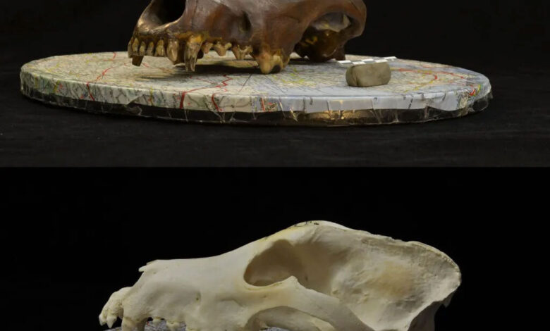 جمجمتان تستخدمان للتحليل: جمجمة كلبية أثرية (أعلى) وجمجمة كلب حديثة (أسفل)