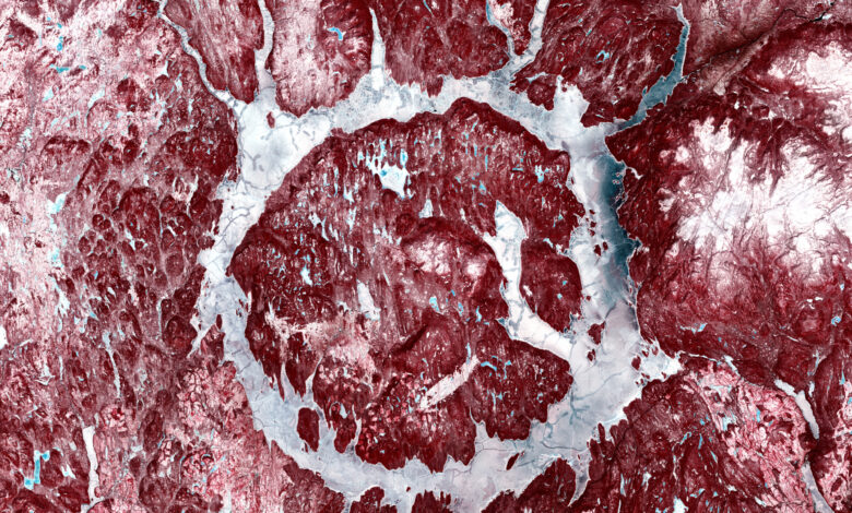 في صورة حديثة ذات ألوان زائفة، شاهد القمر الصناعي Sentinel-2 أ “حلية” على سطح الأرض. في لمحة، يبدو وكأنه زخرفة عطلة باللونين الأحمر والأبيض في منظر طبيعي شتوي. لكن “الحلي” ليست زخرفية على الإطلاق، بل هي كذلك فوهة مانيكوجان في مقاطعة كيبيك الكندية، وهو هيكل دائري ملحوظ يبرز حتى بين المعالم الجيولوجية الأكثر وضوحًا على الأرض.