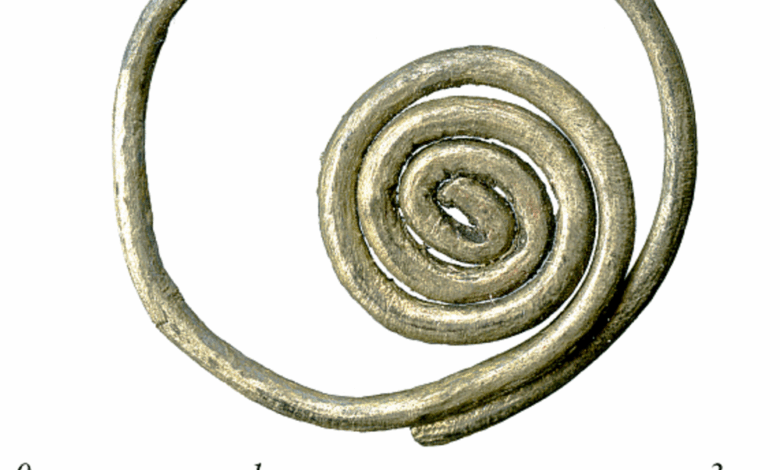 القطعة الأثرية الأولى عبارة عن حلقة حلزونية، من المفترض أنها مصنوعة من الفضة. إنها فريدة من نوعها بالنسبة للمنطقة. في السابق، حاول الباحثون ربطها بالاكتشافات الشمالية في القرنين الحادي عشر والثاني عشر، ولكن تم رفض هذه الفرضية لاحقًا.