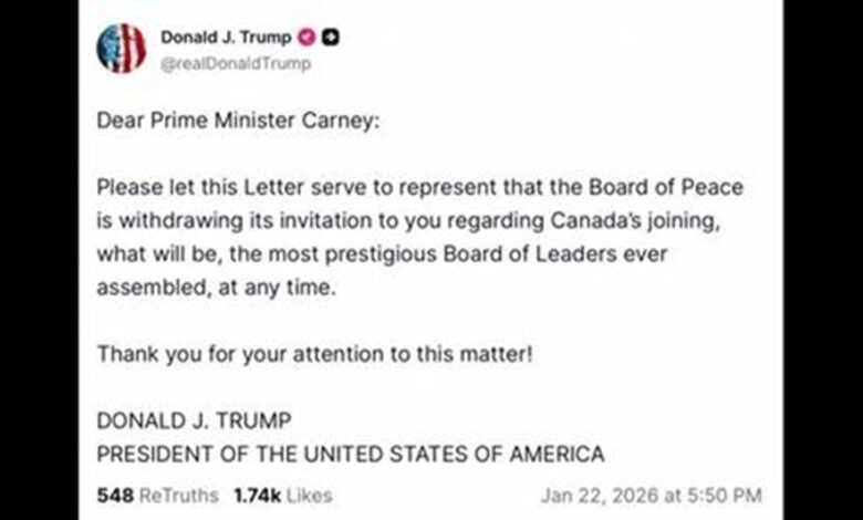 وفي رسالة نشرها على منصته تروث سوشال ووجّهها إلى كارني،قال ترامب إن “مجلس السلام يسحب دعوته لكم بشأن انضمام كندا”.