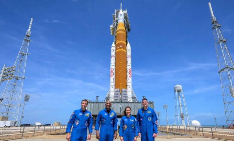 وصل رواد الفضاء إلى موقع الإطلاق يوم الجمعة (27 مارس) وهم في الحجر الصحي قبل الإطلاق. اليوم، قاموا بزيارة منصة الإطلاق والتقطوا صورة للطاقم مع صاروخ SLS ومركبة أوريون الفضائية. وقال نيلسون إنه من المتوقع أن يتناولوا العشاء مع أفراد الأسرة المقربين في المنزل الشاطئي الشهير التابع لوكالة ناسا، حيث يسترخي أطقم رواد الفضاء قبل البعثات لعقود من الزمن.