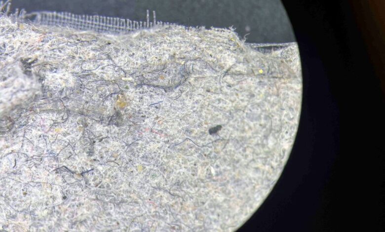 جزيئات الألياف الدقيقة عالقة في مرشح الغسالة أثناء الاختبار