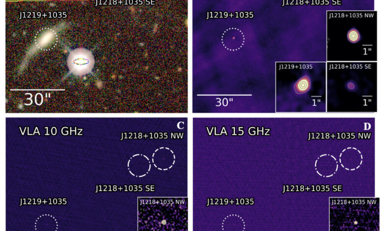 أكد علماء الفلك لأول مرة وجود نظام مكون من ثلاثة ثقوب سوداء فائقة الكتلة تغذي بشكل نشط وتقع في ثلاث مجرات مندمجة. ويقع الجسم، المعروف باسم J1218/1219+1035، على بعد حوالي 1.2 مليار سنة ضوئية من الأرض. تبعث النوى المجرية الثلاث انبعاثًا راديويًا قويًا، مما يجعلها “منارات” حقيقية في الفضاء. ونشرت نتائج الملاحظات في رسائل مجلة الفيزياء الفلكية.