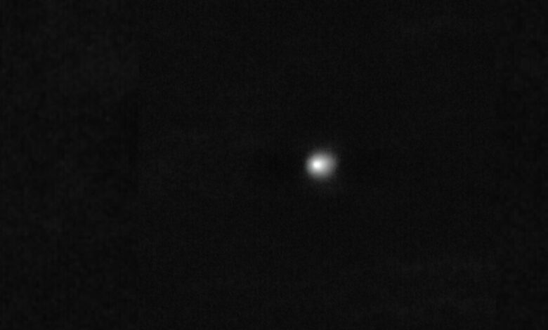 وتظهر الصورة ذات التعريض الضوئي لمدة 300 ثانية هذا الجسم المتجول في النظام الشمسي كنقطة صغيرة بالكاد يمكن تمييزها بين العمالقة النجمية التي تملأ حقل النجوم البعيدة خلفه.