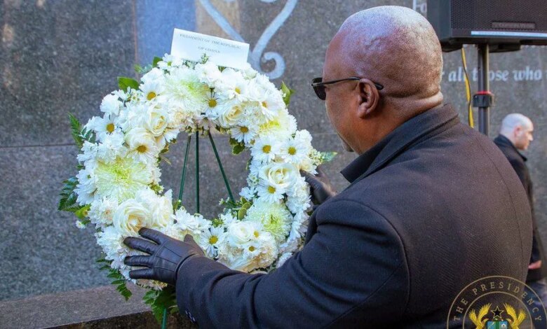 في منفصلة خطاب وفي مراسم وضع إكليل من الزهور في مقبرة الدفن الأفريقية في مانهاتن السفلى، قال ماهاما إن معظم الأفارقة المستعبدين من المحتمل أنهم مروا أو جاءوا من غانا، التي لديها حصون وقلاع للعبيد أكثر من أي دولة أخرى في القارة.