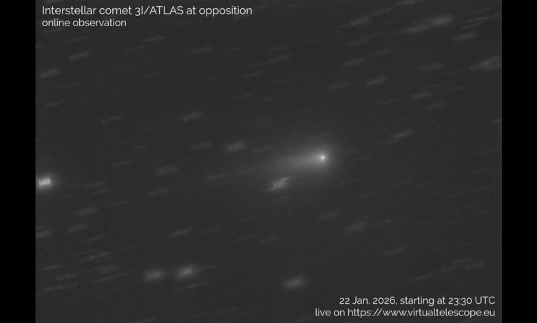 تابعونا الليلة (22 يناير) لمشاهدة مناظر حية للمذنب بين النجوم 3I/ATLAS في المعارضة، حيث يظهر مقابل الشمس في سماء الأرض ويخرج من النظام الشمسي، بفضل مشروع التلسكوب الافتراضي.