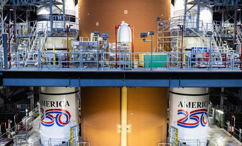 تشتمل الأجهزة التي ستطير رواد الفضاء نحو القمر على معززين مزدوجين يبلغ طولهما 177 قدمًا (54 مترًا)، وهما العمود الفقري للعملاق نظام إطلاق الفضاء (SLS) قوة إطلاق الصاروخ. في الآونة الأخيرة، كان المعززان اللذان سيطيران في مهمة Artemis 2 يحملان شعار “America 250” رسمت على جوانبهم، تكريما للقادم. الذكرى 250 لتوقيع إعلان الاستقلال.