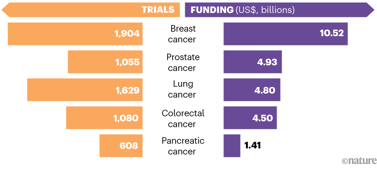 زاد التمويل الذي يقدمه المعهد الوطني الأمريكي للسرطان لأبحاث سرطان البنكرياس في السنوات الأخيرة. وبين عامي 2017 و2023 ارتفعت بنسبة 38%. ولكن، بشكل عام، الاتجاه هو أن تمويل سرطان البنكرياس يتخلف عن تمويل أنواع السرطان الشائعة الأخرى. وقد يفسر هذا سبب وجود عدد أقل من التجارب السريرية، وبالتالي انخفاض عدد الاكتشافات في علاج المرض.