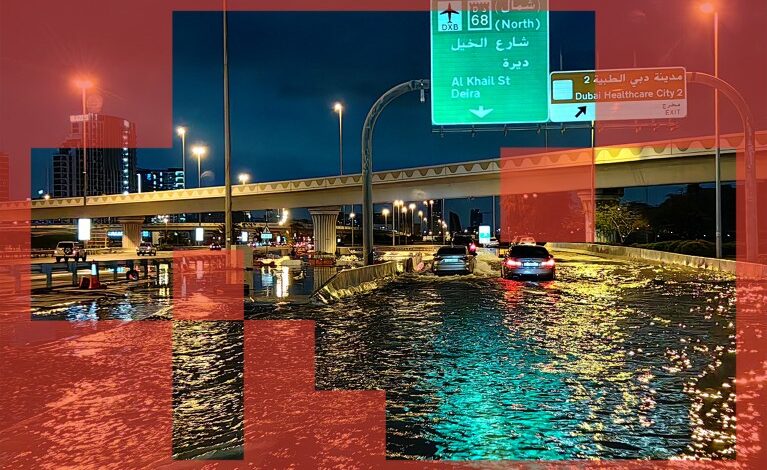 وفي إبريل/نيسان من العام الماضي، تساقطت أمطار في دبي في يوم واحد أكثر مما كان متوقعاً في العادة خلال عام كامل.تصوير: جوزيبي كاساسي/وكالة الصحافة الفرنسية عبر جيتي