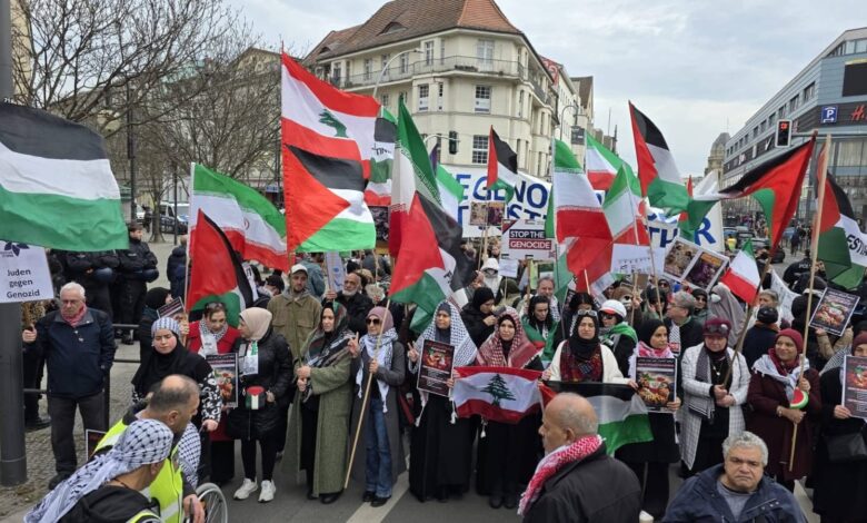 مظاهرة حاشدة في برلين تضامنًا مع فلسطين ورفضًا للعدوان الأميركي الإسرائيلي على إيران ولبنان