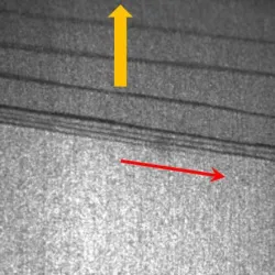 إطار فيديو تم تصويره من الأسفل يظهر كسورًا عرضية تتشكل في المادة اللاصقة. (لي وآخرون، قبل، 2026)