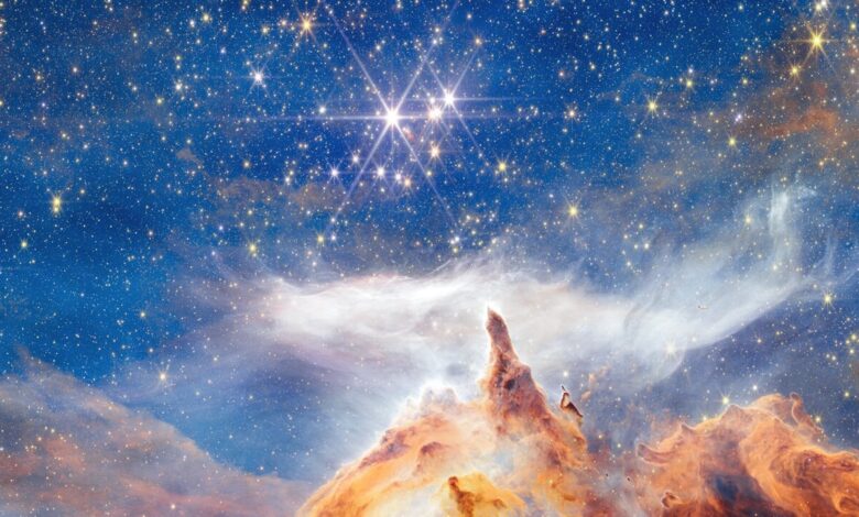 قمة جبلية كراجي ، برج ، وربما حتى إصبع – في هذا السماوية الجديدة Dreamscape من تلسكوب جيمس ويب للفضاء ((jwst) ، يبدو أن شيئًا ما يشير إلى مجموعة من النجوم الساطعة أعلاه ، كما لو كانت جلسة النجوم تسير في عمق درب التبانة.