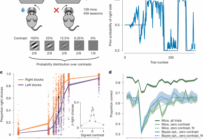 We denote (Xin {{mathbb{R}}}^{Ntimes U}) the aggregated neural activity for a session and (Yin {{mathbb{R}}}^{N}) the Bayes-optimal prior. Here, N is the number of trials and U the number of units. We generated the null distribution from pseudosessions, that is, sessions in which the true block and stimuli were resampled from the same generative process as the one used for the mice. This ensures that the time series of trials in each pseudosession shares the same summary statistics as the ones used in the experiment. For each true session, we generated M = 1,000 pseudosessions, and used their resampled stimulus sequences to compute Bayes-optimal priors ({Y}_{i}in {{mathbb{R}}}^{N}), with i ∈ (1, M) the pseudosession number. We generated pseudoscores ({R}_{i}^{2}in {R},{i}in (1,{M})) by running the neural analysis on the pair (X,Yi). The neural activity X is independent of Yi as the mouse did not see Yi but Y. Any predictive power from X to Yi would arise from slow drift in X unrelated to the task itself. These pseudoscores ({R}_{i}^{2}) were compared to the actual score R2 obtained from the neural analysis on (X,Y) to assess statistical significance.