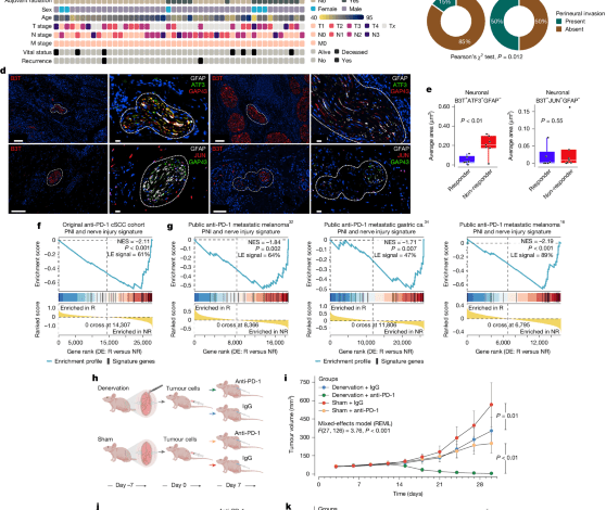 This 46-gene PNI/nerve injury signature was first tested on our anti-PD-1 neoadjuvant cSCC clinical trial bulk RNA-seq data using GSEA. GSEA was conducted to investigate the enrichment the signature in the pretreatment trial tumour samples performing 1,000 permutations63. GSEA calculates an enrichment score (ES) for gene sets by ranking genes based on their overrepresentation in two groups. A positive ES indicates enrichment in one group, while a negative ES indicates enrichment in the other. The ES is normalized to a NES to enable comparisons. We considered the gene sets to be significantly enriched at a threshold of P < 0.05. We did not apply corrections for multiple-hypothesis testing in this case, as only a single gene signature was assessed. The 46-gene PNI/nerve injury signature was later validated in external, publicly available cohorts of patients who had PNI-associated tumours and were treated with anti-PD-1 therapy. The bulk RNA-seq data of three patient cohorts were available (two melanoma32,33 and one gastric cancer34; Supplementary Table 2):