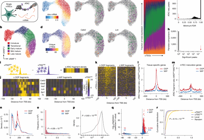 Cells from early mature, mid mature and late mature clusters expressing any αTSGi > 0 were selected as the αTSGpos cohort and a size-matched cohort of αTSGneg cells was sampled randomly from the remaining cells from the same three clusters. These cohorts were then used as inputs to getMarkerFeatures()in ArchR for differential accessibility of peaks between αTSGpos and αTSGneg mTECs. For local OOP and WIP analysis, ATAC-seq fragments within peaks and outside of peaks from αTSGpos and αTSGneg cohorts were intersected with a ±5 kb sliding window with 1 kb increments, normalized to the total number of ATAC-seq fragments per cell, and tallied in each window within a region flanking αTSGi . For αTSG coexpression analysis, the probability of detecting each αTSGi  neighbouring αTSG0  within the specified length scale (or a randomly selected alternative αTSG as a control) was computed for each of the αTSGpos and αTSGneg cohorts.